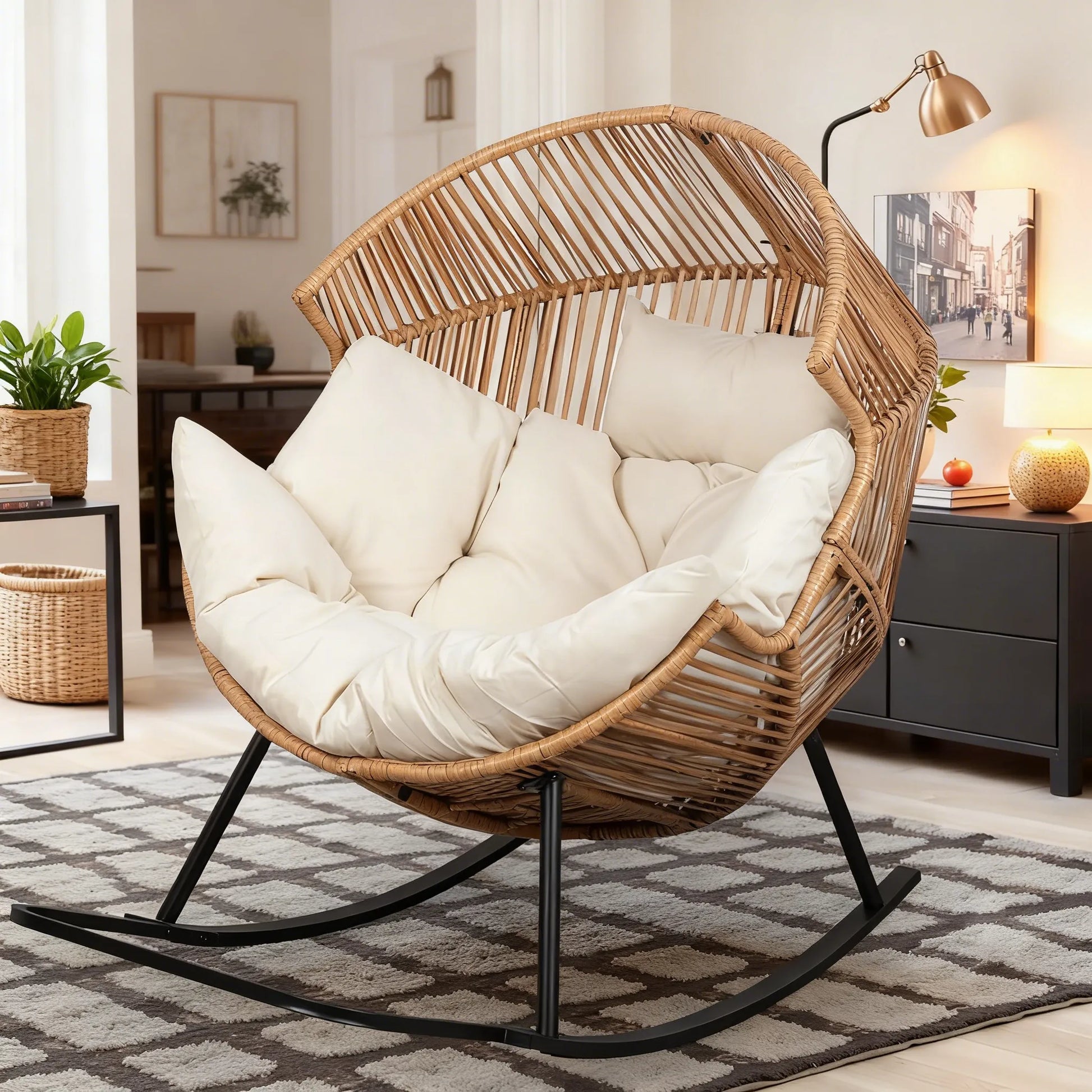 PE Rattan Rocking Egg Chair, Oversized Patio Lounge with Cushion for Backyard, Garden & Indoor Spaces (Beige)